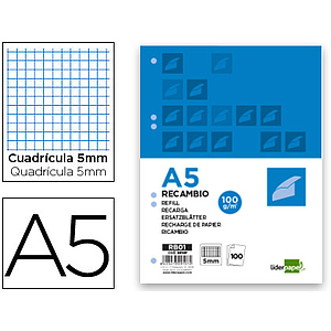 LIDERPAPEL - RECAMBIO A5 100 HOJAS 100G/M2 CUADRO 5MM CON MARGEN 6 TALADROS (Ref.RB01)