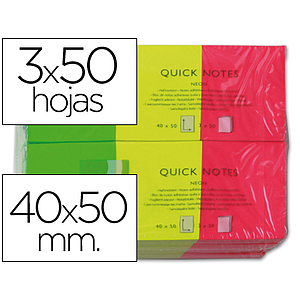 Q-CONNECT - BLOC DE NOTAS ADHESIVAS QUITA Y PON 40X50 MM FLUORESCENTES PACK DE 3 CON 50 HOJAS (Ref.KF01224)