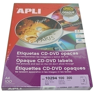 APLI - ETIQUETAS ADH.IMPR. A4 MULTIMED.CD-DVD MEGA CAJA 100h DORSO OPACO Ø ext.114 e int.18 mm 300 uds.() (Ref.10294)