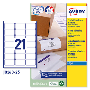 AVERY - PAQUETE 25 HOJAS ETIQUETAS BLANCAS QUICK DRY-IMPRESORAS DE INYECCIÓN DE TINTA-63,5X38,1 MM (Ref.J8160-25)