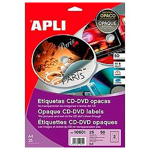 APLI - ETIQUETAS ADH.IMPR. A4 MULTIMED.CD-DVD MEGA BLISTER 25h DORSO OPACO Ø ext.117 e int.18 mm 50 uds.() (Ref.10601)