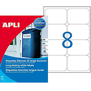 APLI - Paquete con 20 hojas (160 Etiquetas) Ref. RESISTENTES A LA INTEMPERIE. Medidas de la Etiqueta: 99,1 x 67,7 mm - Cantos Romos - 8 Etiquetas por Hoja (Ref.15087)
